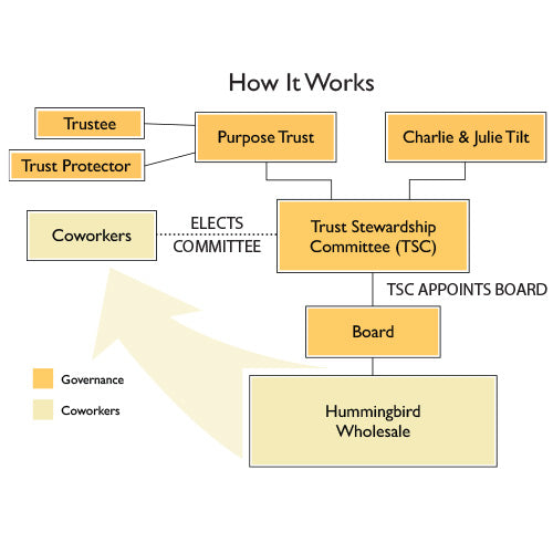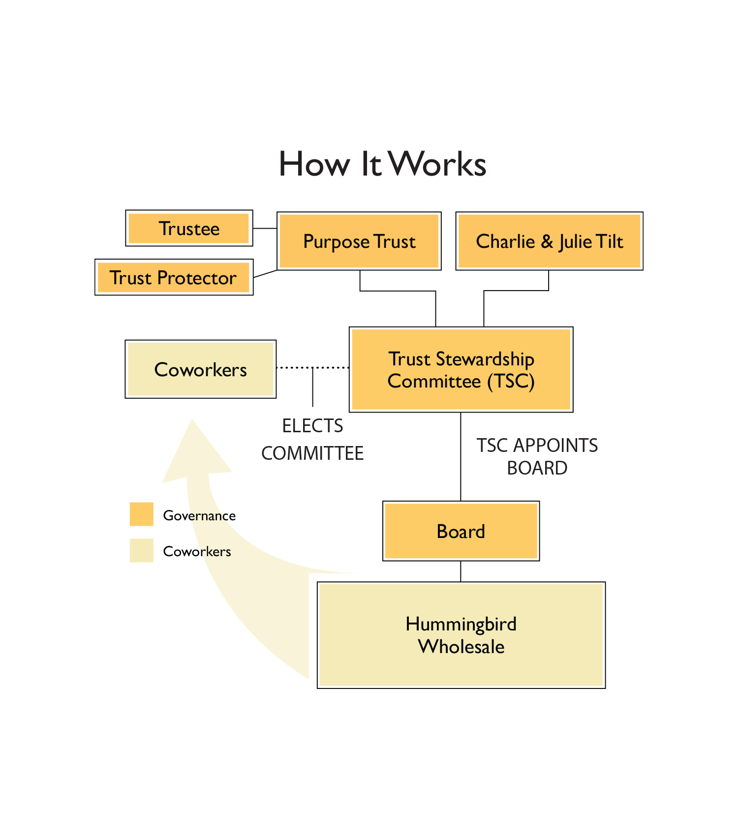 In January 2023, Hummingbird owners Charlie and Julie Tilt made a bold move by transitioning their ownership of the company to an Employee Owned Purpose Trust, securing and guiding the mission and values of the business into perpetuity. The Purpose Trust was established to serve as a co-creator of life-enhancing, inclusive, and healthy food systems for our regional and global community. The coworkers, affectionately “the birds”, elect the Trust Committee which appoints the Board. The Board oversees the CEO, who works in partnership with the Leadership Team and coworkers to carry out the business of serving our customers, building relationships with vendors, and supporting healthy farming outcomes.