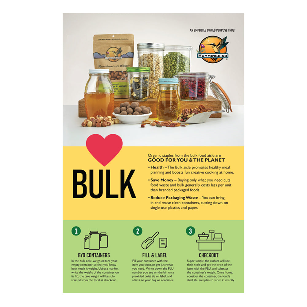 This is our 11" x 17" vertical poster that offers the benefits and value of buying from the bulk aisle. It also has the simple step by step instructions for how to use your own container to shop the bulk bins. Organic staples from the bulk food aisle are GOOD FOR YOU & THE PLANET!