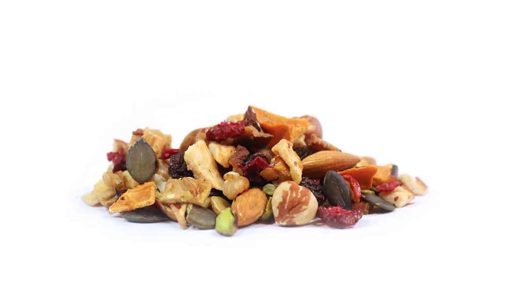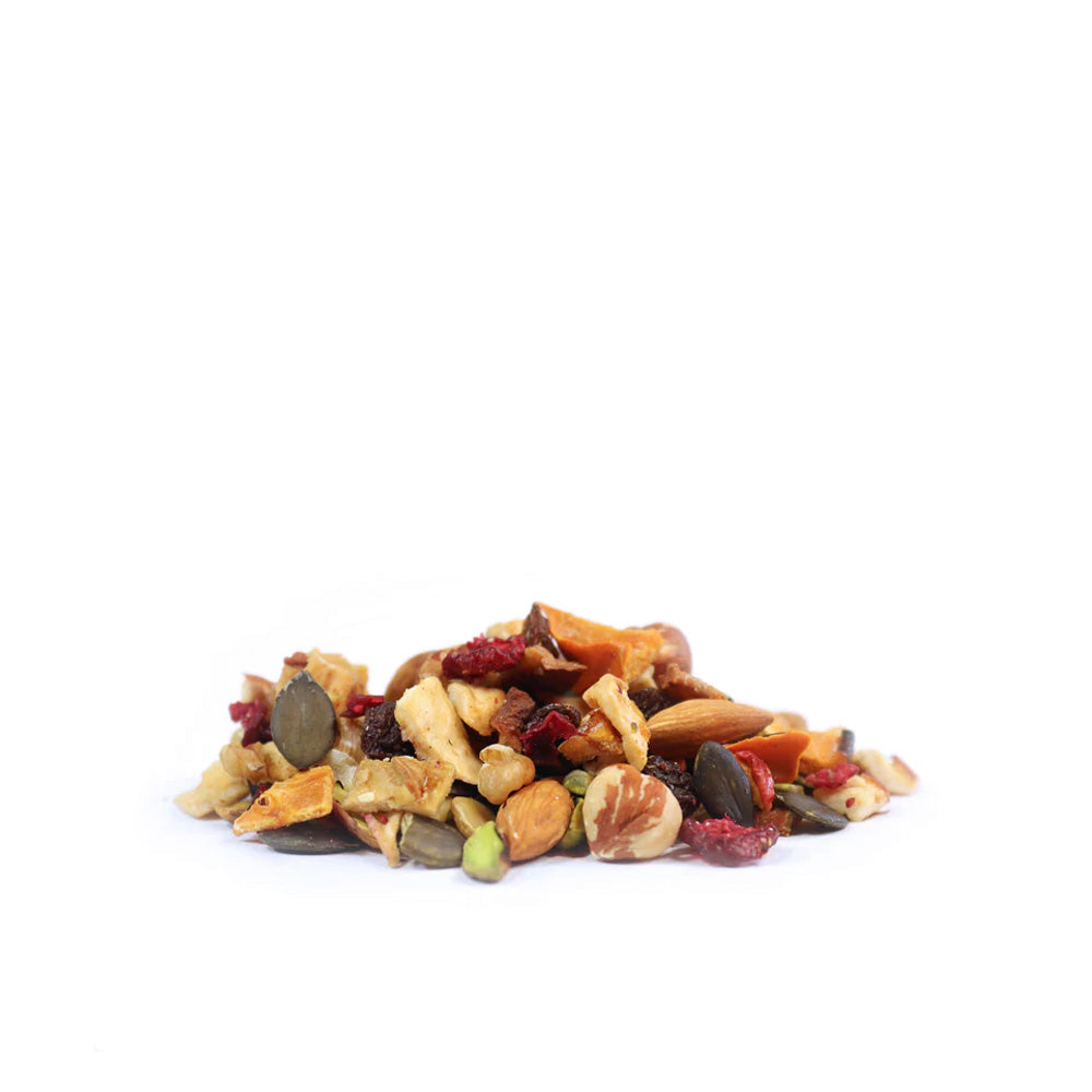- Ingredients: Roasted Organic Hazelnuts, Sprouted Organic Pumpkin Seeds (Organic Pumpkin Seeds, Salt), Roasted Organic Almonds, Organic Walnuts, Organic Pistachios, Dried Organic Cranberries (Organic Cranberries, Organic Wildflower Honey), Organic Flame Raisins, Dried Organic Pear, Dried Organic Apple.